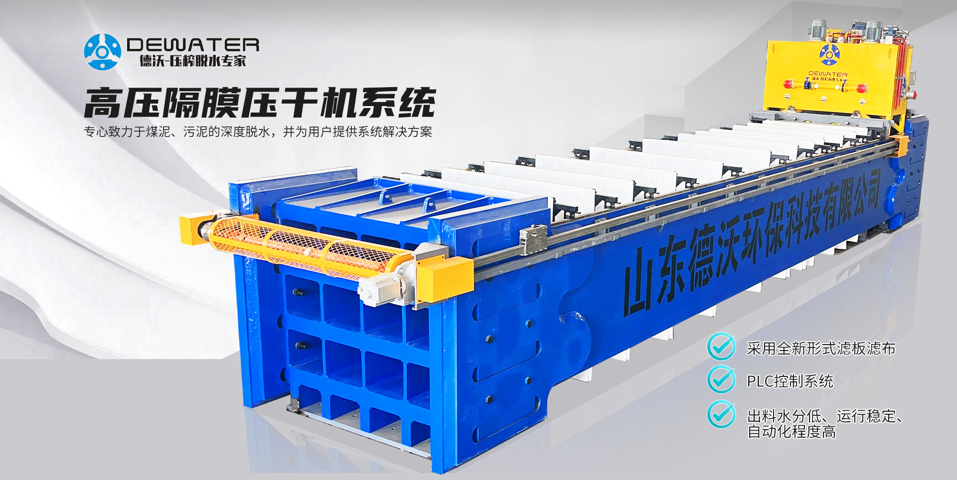 德沃研发的高压隔膜压干机,是在传统隔膜压滤机工作原理基础上提升设计,通过原材料优化、进料出水结构改进、采用全新形式滤板滤布、高标准的工况泵阀,结合自行设计的PLC控制系统,达到出料水分低、运行稳定、自
